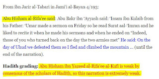 Some of the opponents refuse to accept these narrations based off of a supposed weakness of the chain. Take for example the objections from twelvershia.net, youpuncturedtheark blog, and islamistruth blog:As you can see they object to the otherwise pristine chain of narrators by claiming that one of the narrators, Abu Hisham Al Rifa'ee is very weak and untrustworthy, rendering the entire narration as rejected. Before we move on to refute this contesting by the opponents lets look at all of the narrators in the chain.